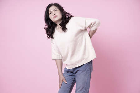 Young Asian male chef or waiter wearing blue apron suffer from lower back pain. Close up body portrait isolated on white