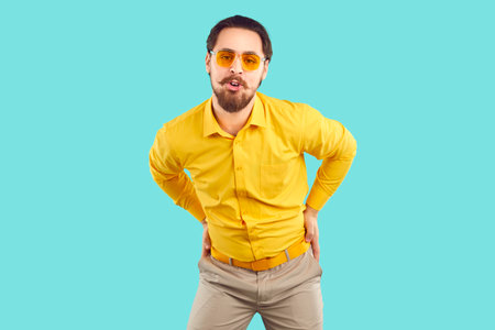 Studio shot of funny macho man in modern stylish outfit. Self confident guy wearing yellow shirt, beige pants, and cool trendy sunglasses dancing isolated on turquoise background. Fashion concept
