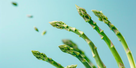 A bunch of green asparagus are shown in the air