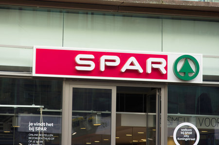 Arnhem, Netherlands - February 9, 2023: Logo of Spar supermarket store on the facade of the building in shopping street