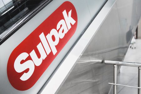 Logo of a large retailer of Kazakhstan Sulpak on an escalator in a shopping center. Almaty, Kazakhstan - April 15, 2023