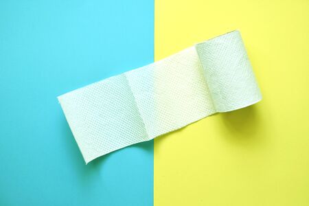 Roll of yellow toilet paper on a blue background. Personal hygiene concept. Flat lay, top view.