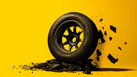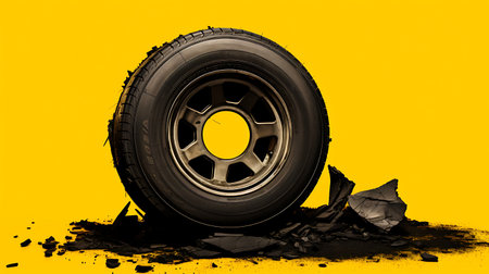 Broken car tire on a yellow background. The concept of a car accident.