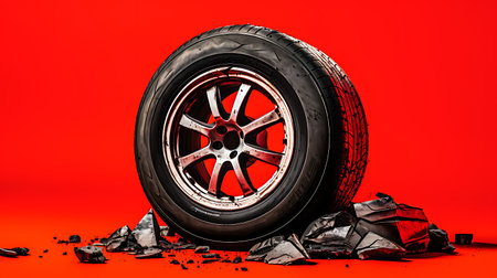 Car wheel with cracked tires on a red background. The concept of car repair.