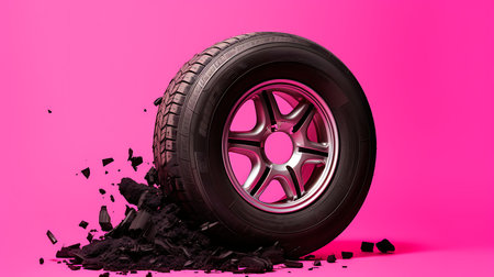 Broken car wheel on a pink background. 3d rendering.