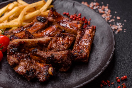 Delicious barbecued ribs seasoned with a spicy basting sauce and served with baked tomatoes. Gray background. Top view.