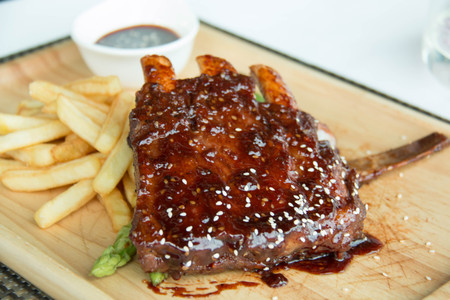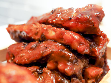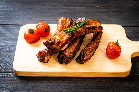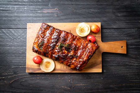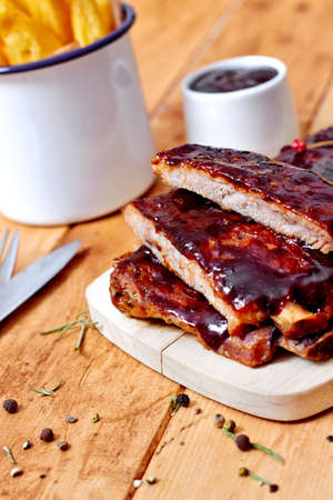 Pork ribs grilled with BBQ sauce. Tasty snack on wooden board. Food recipe background. close up.