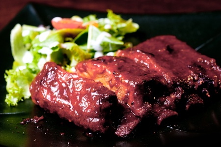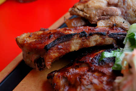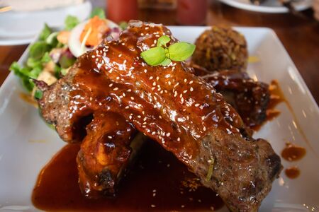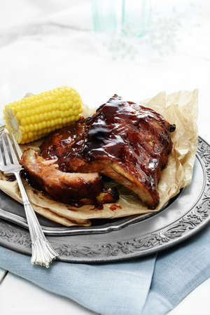 Delicious grilled pork ribs with barbecue sauce, over old ceramic plate, in the restaurant