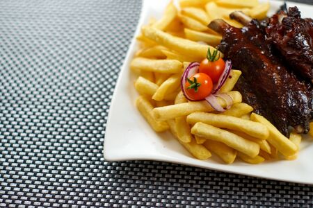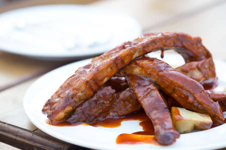 Grilled barbecue pork ribs in a white plate as menu in pub or restaurant.