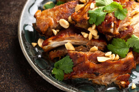 Close up board with pork ribs grilled with BBQ sauce, peanuts and jalapeno