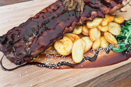 hot appetizing ribs with homemade potatoes, salad and sauce on a wooden board