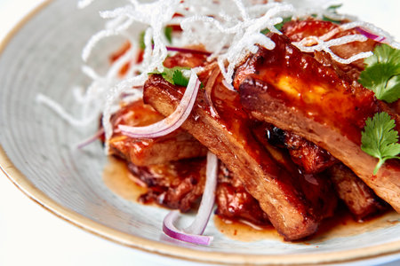Barbecued and marinated sticky spare ribs on a white background with copy space.