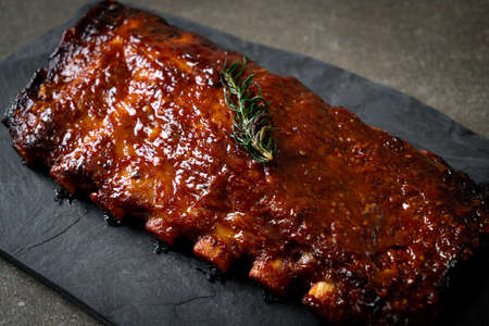 Barbecue beef ribs with bbq sauce sliced on a stone board