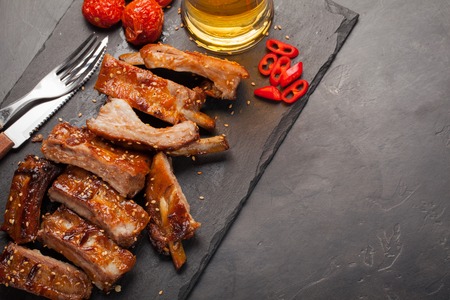 Hot barbecue ribs with hoisin sauce and beer, copy space
