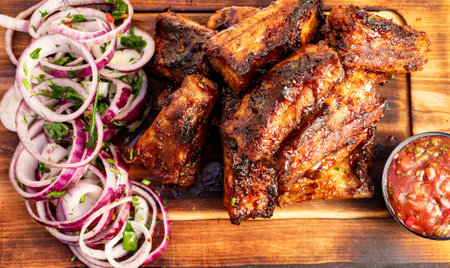 Grilled ribs rest on a wooden platter next to sliced onions, herbs, and a small bowl of salsa.