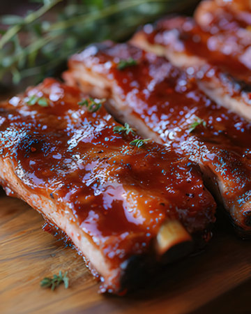 Juicy, caramelized ribs glazed to perfection, topped with sprigs of rosemary and aromatic herbs, displayed on a weathered wooden platter for a hearty barbecue feast.