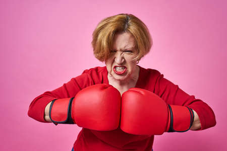 Woman aged in boxing gloves. The concept of the fight against old age.