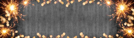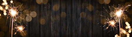 Silvester party New year background banner panorama long- sparklers and bokeh lights on rustic wooden texture, with space for text