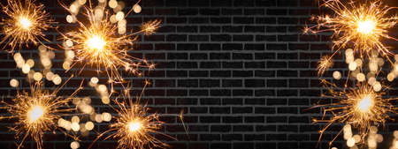 New Year Silvester Party festive holiday background banner greeting card - Rustic black anthracite brick wall texture, with frame made of sparkling sparklers and bokeh lights, with space for text