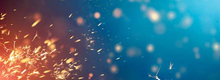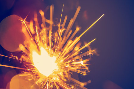 sparkler on a dark blue background with sparks and bokeh