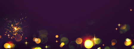 Dark night sky with glowing sparklers and golden bokeh. Horizontal background for Christmas and New Year with space for text. New Year's Eve fireworks.