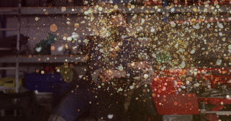 Yellow sparks from cutting metal illuminated on black background magical technology shed