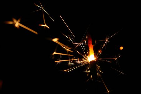 Burning sparkler in yellow and orange light on a black background. Closeup photo of Christmas and new year sparkler. Can be used like a wallpaper or postcard.
