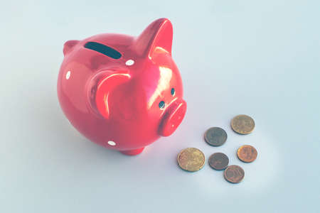 Top view of a red piggy bank with euro coins scattered nearby. Money accumulation concept, child money or poverty concept.