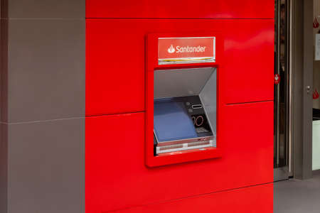 Spain, November 2021: ATM with the new Santander bank logo in Pozuelo de Alarcon, Madrid