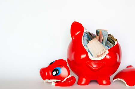 Red piggy bank breaking with Thai baht bank note inside put on white background.