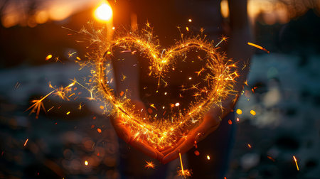 A person holds a sparkler in the shape of a heart, creating a magical display against a soft sunset, symbolizing love and celebration.