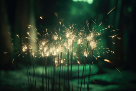 sparkling sparkler in the green area. sparkler fire with blurred bokeh background. new year or St. Patrick's Day.