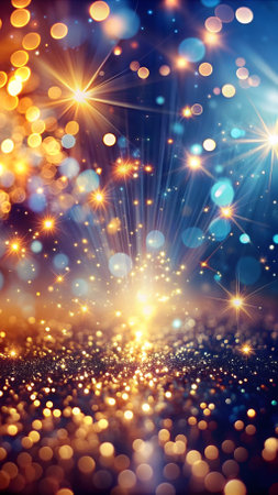 Soft, out of focus bokeh lights in golden yellow and blue tones are scattered across a dark, textured glitter background, with a bright lens flare adding a highlight.