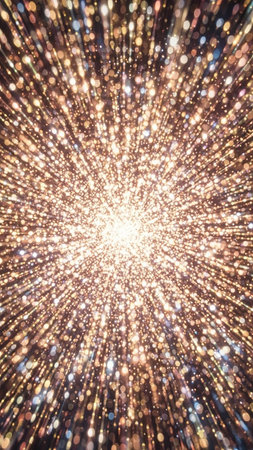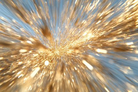Vibrant showing a vibrant explosion of golden and silver confetti and glitter bursts outwards from a central point creating a energetic, and celebratory abstract...