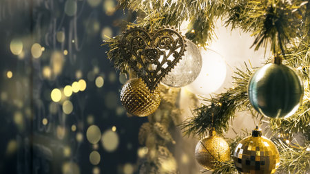 Golden baubles with fairy lights on Christmas tree at home. Holiday ornament with balls and lamp garland on fir tree. Festive decoration with sparkling details and lights on blurry background