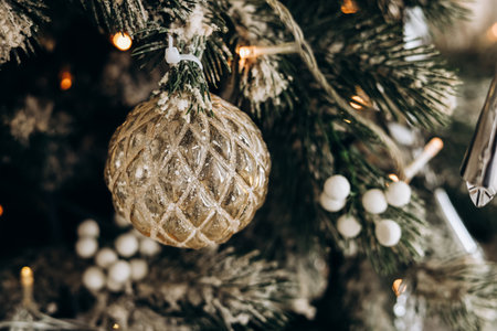 Decorated Christmas ball on fir tree New Year holidays background