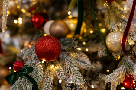 Decorated Christmas tree on blurred background. Christmas decoration. Hanging red balls on pine branches christmas tree garland and ornaments over abstract bokeh background with copy space