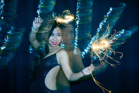 Beautiful white female with sparkles on her face holding sparklers in a festive background. Concept of celebration, party, holiday joy, magical glow, Christmas, New Year.