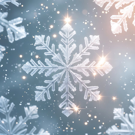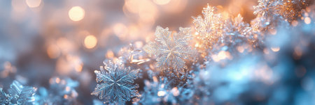 Delicate, intricate snowflake crystals with frosty details in a soft winter glow, highlighting the beauty of natural ice formations.