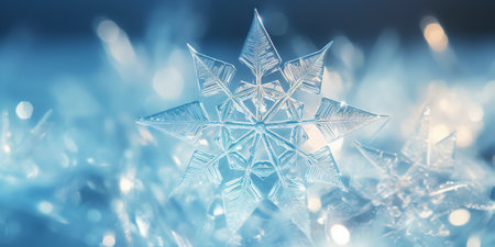 Macro photograph of a single, intricate snowflake surrounded by frosty crystals and soft bokeh lights.