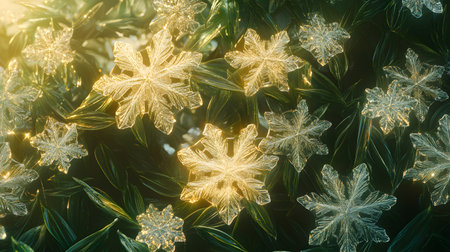 Many intricate, translucent snowflakes on dark green leaves, bathed in warm sunlight.