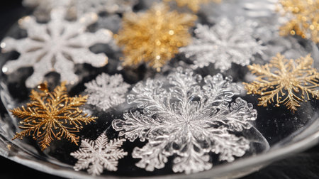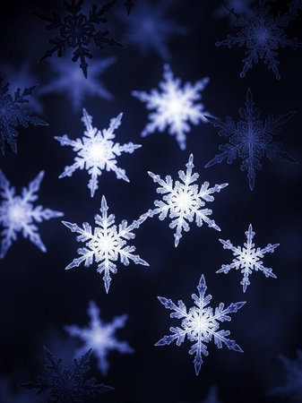 An enchanting closeup image of delicate, intricate snowflakes shimmering beautifully against a rich, dark background, evoking the pure essence of winter and the joyful spirit of the holiday season