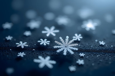 Snowflakes with intricate patterns on dark blue surface, spacious area for text