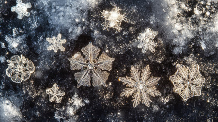 A captivating collection of unique snowflake designs scattered on a black background, showcasing intricate patterns and delicate textures for winter aesthetics.