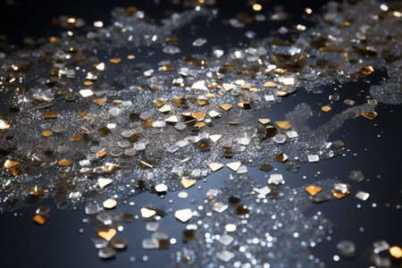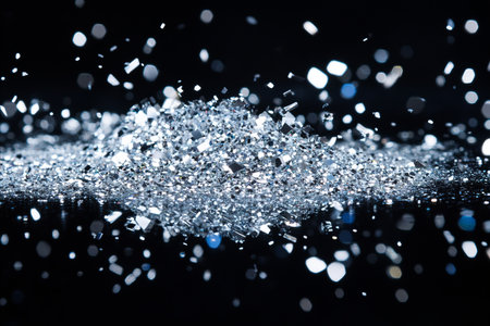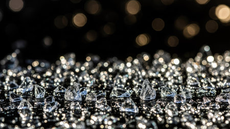 Macro shot of broken diamonds on a black reflective surface. Shallow depth of field.