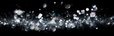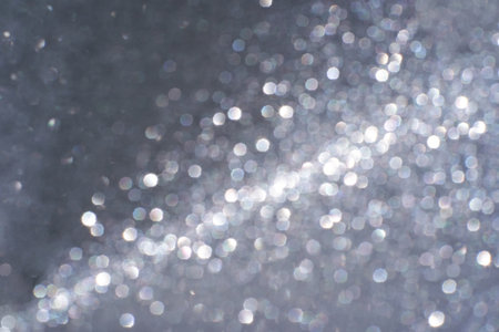 Abstract silver bokeh light pattern with circular glittering effect on dark background.