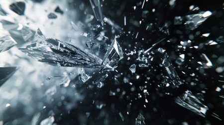 A minimalist depiction of a symmetrical crystal structure shattering into asymmetrical pieces representing the breaking of symmetry in the world of crystals