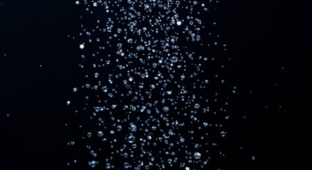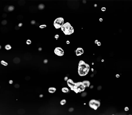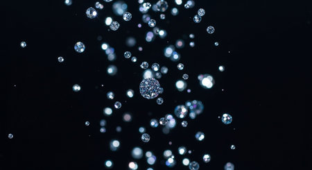 An enchanting close-up of crystal-clear water droplets bouncing with reflections in bright light. This image captures the beauty of fluid dynamics and natural elements.