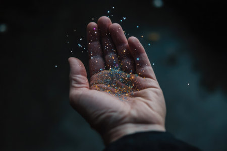 A hand outstretched, palm open, displays countless tiny stars sparkling as if holding a fragment of the universe. This ethereal scene evokes feelings of wonder and magic.