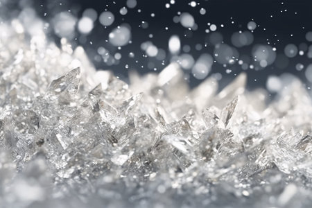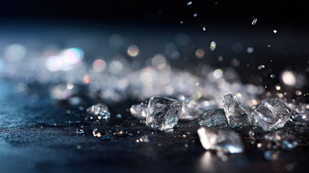 A close-up of sparkling crushed ice spread across a glossy black surface, with dramatic lighting highlighting the crystal textures